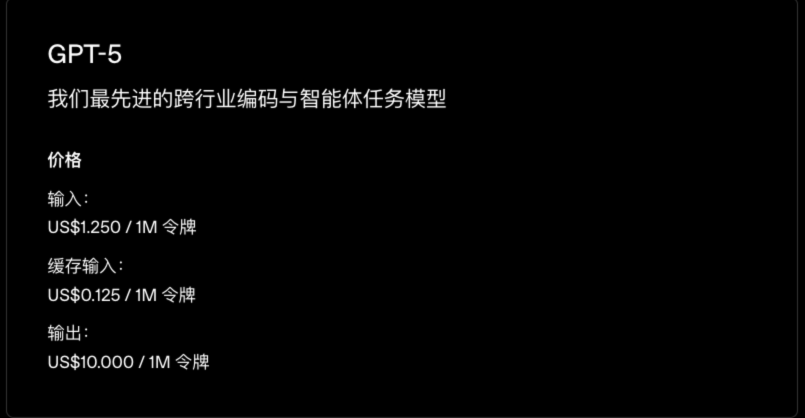 | GPT-5 | 我们最先进的跨行业编码与智能体任务模型 | 1.250 | 0.125 | 10.000 |