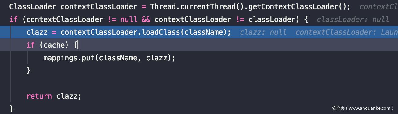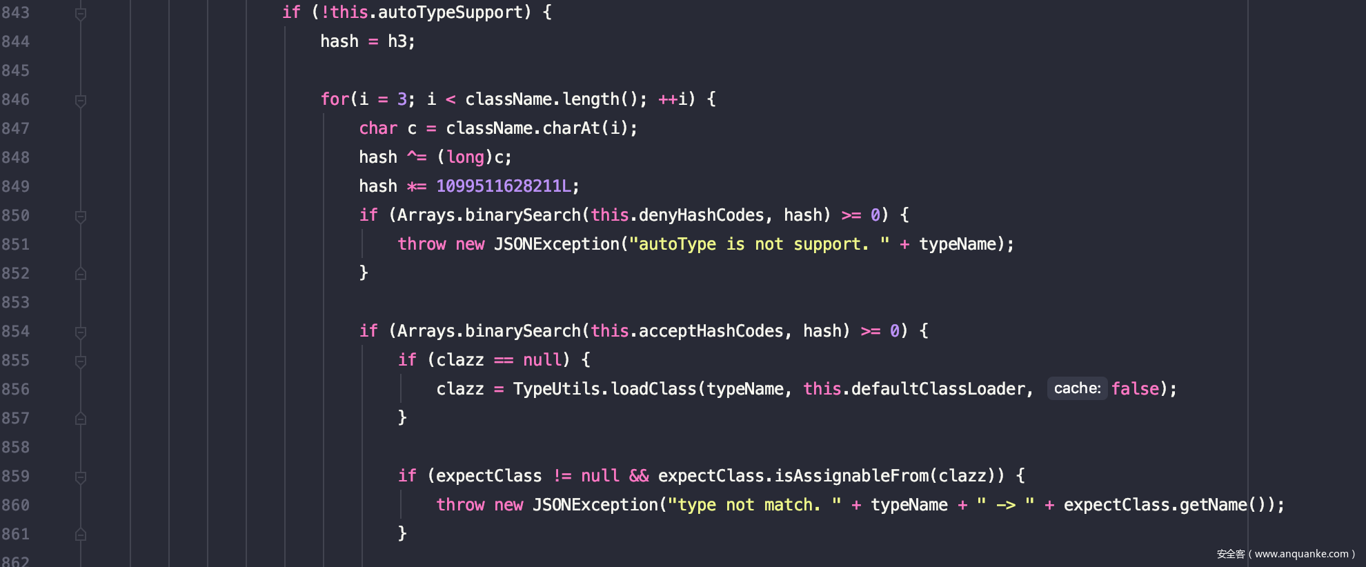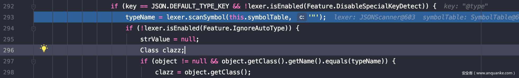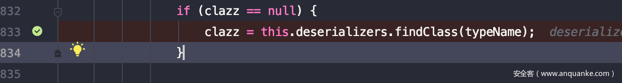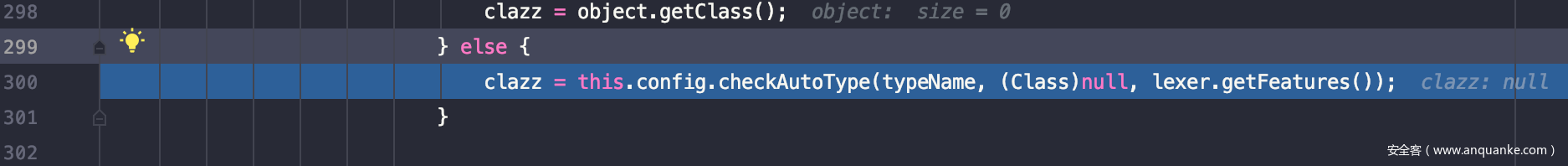 因为在上面获取的map中就返回了clazz的值,所以这里就直接返回了com.sun.rowset.JdbcRowSetImpl类,也就没有了下面的黑白名单检测,也就成功绕过了checkAutoType