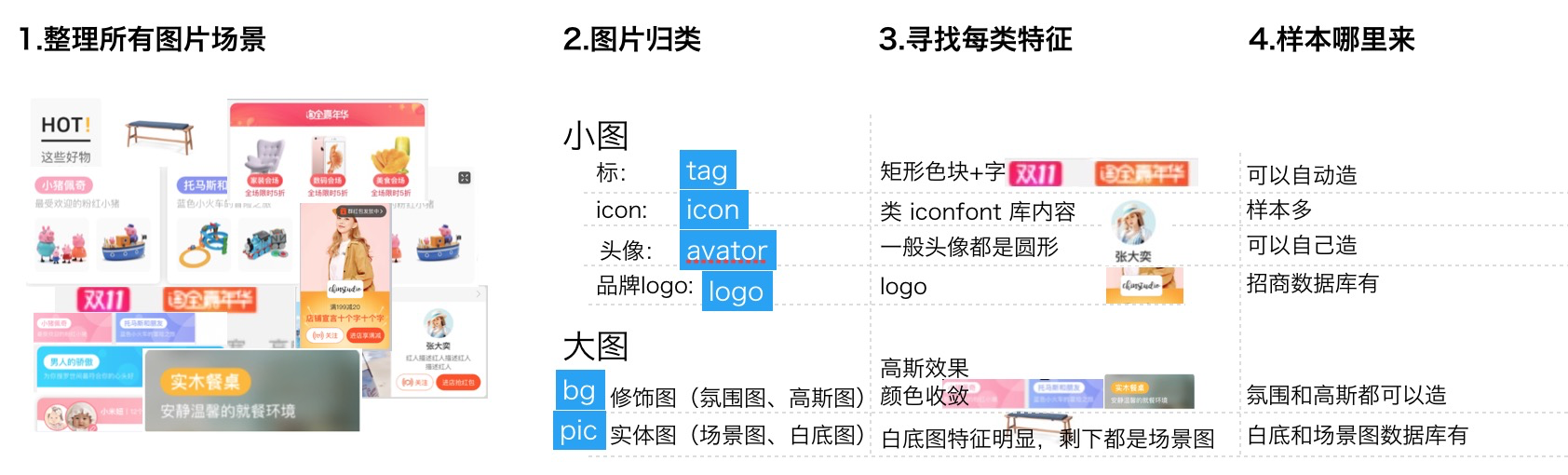 - 第四步:每类图片的数据样本来源是否有,没有的话能否自动造;如果数据样本无法有,那就不适合用模型,可以改用算法规则等方式替代先看效果。