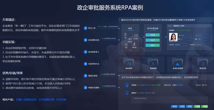 - RPA和NLP结合,可以自动解析现有应用程序和文档,来处理事务