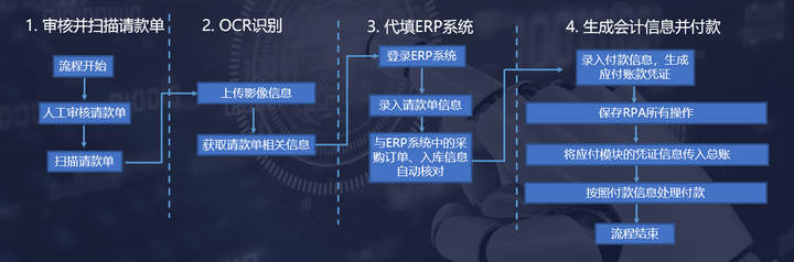 企业内部生成应付账款会计信息时,需要获取大量请款单中金额、收款人、收款日期等基本信息,并需要和ERP系统中的采购订单、入库信息一一核对,方可生成应付账款凭证,并将凭证信息传入总账、按日期付款,人工切换系统录入费时费力且容易出错。