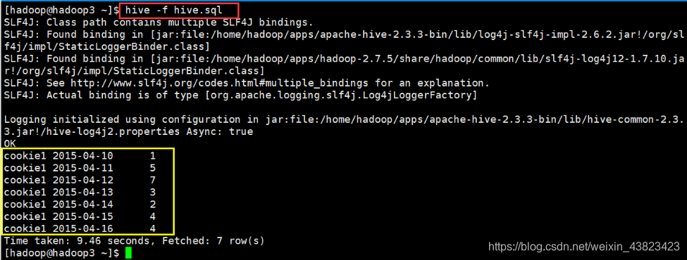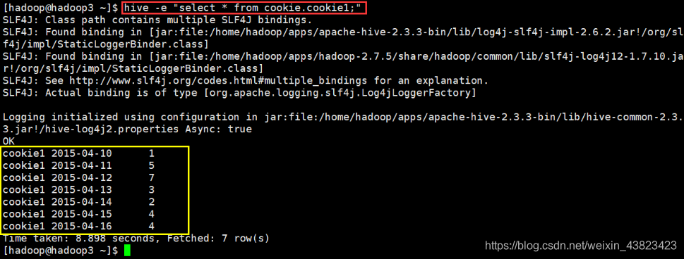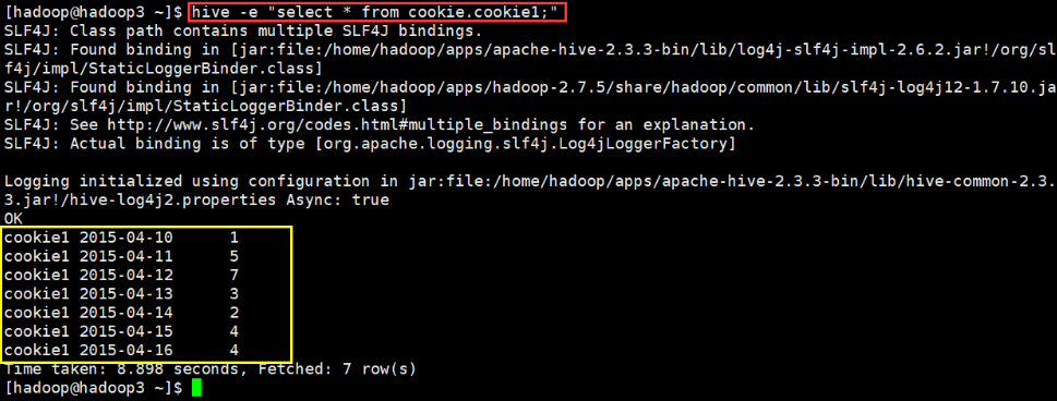 [qyl@qyl01 ~]$ hive -e "select * from cookie.cookie1;"