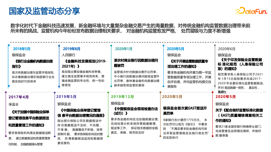 从国家及监管动态上来看,目前,数据治理已经不止停留在监管层面,更上升到国家的高度,这个趋势体现在最近发布了一系列相关的法律法规,包括数据安全法、个人信息技术保护法、个人信息保护法、网络安全法等。2018 年,银行业整合了近十年的历史经验,发布了《银行业金融机构数据指引》,该指引从审计、监管等方面规范了银行业的行为准则;2020 年 1 月,监管部门首次针对数据治理问题,对某农村商业银行开出罚单,表明数据治理真正纳入监管范围。继而,银保监会发布的各项制度愈发细化,陆续发布了针对数据质量、数据标准、信息管理等方面的制度。2020 年 5 月,银保监会首次针对 EAST 报送开出罚单,并发布了关于《配合做好监管标准化数据(EAST)质量稽核调查相关工作的通知》。