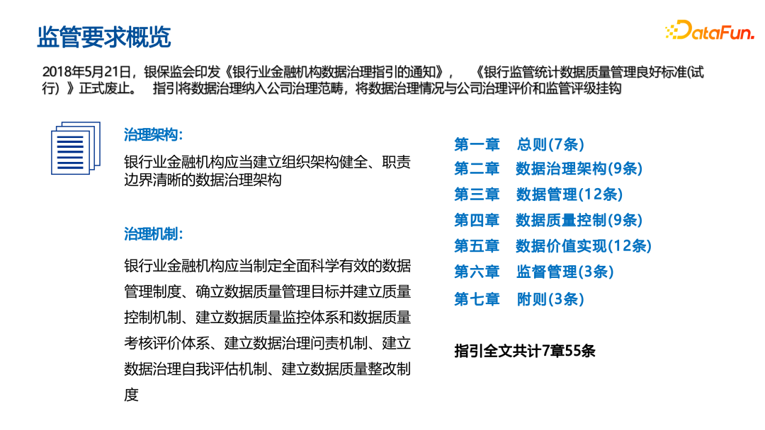 相对于互联网和传统行业而言,银行业在数据治理方面起步早,在 21世纪初已经开始布局数据治理的相关工作,目前处于较前沿的位置。2018 年发布的《银行业金融机构数据指引的通知》从治理架构和治理机制方面对银行业近十年的经验进行总结,明确提出要建立组织架构健全、职责边界清晰的数据治理架构、制定全面科学有效的管理制度、确立数据质量管理目标并建立质量控制机制、建立数据质量监控体系和数据质量考核评价体系、建立数据治理问责机制、建立数据治理自我评估机制、建立数据质量整改制度等。该指引共 7 章 55 条,第一章为总则,第二章到第六章分别从数据治理架构、数据管理、数据质量控制、数据价值实现和监督管理方面解读了银行业的数据治理机制,第七章为附则。该指引重点针对银行业金融机构如何制定数据治理体系以及数据治理应当发挥的作用。