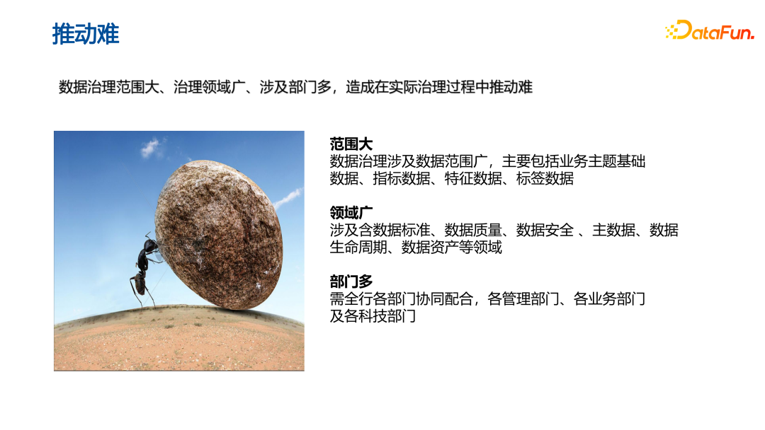 首先,数据治理面临推动难的问题。一是数据治理的范围大,在做数据处理的过程中涉及的范围较广,例如,银行涉及的数据主要包括业务主体基础数据(即业务系统中的数据)、指标数据(包含数仓数据、数据报表数据、指标维度数据等)、风控特征数据和营销标签数据四类;二是治理领域较广,需要针对数据的标准、质量、数据安全、主数据、数据生命周期、数据资产等领域进行治理;三是涉及部门多,整体而言,数据治理是一个全行级、自上而下的工作,需要管理部门、业务部门、科技部门协同配合。