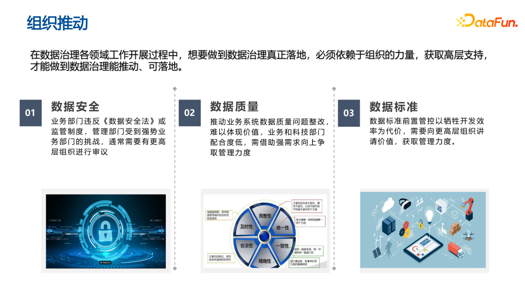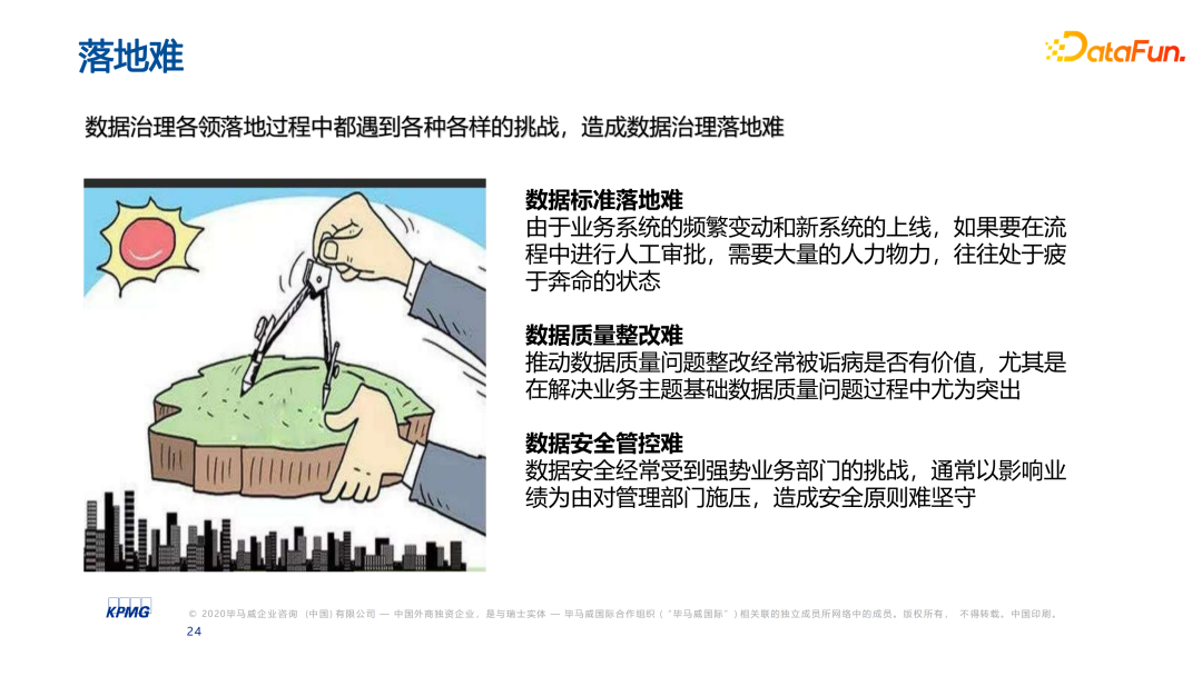 数据治理还面临落地难的问题。数据治理在落地的过程中,会面临诸多挑战。其一是数据标准落地难,以业务主体基础数据,即业务系统的数据为例,新业务系统的上线及数据表的频繁变动都可能是引发该问题的原因。如果想对这些标准进行全方位管理,需要耗费巨大的人力和物力,尤其在三方系统上线时,其改造成本也非常大,包括核心、账管等核心系统的变更及修改时,也需要对数据进行拦截、将数据标准落地,其难度也非常之大。据了解,建行、工行在该方面成效较好,但其投入的人力、物力是一些小银行、小企业很难做到的。所以,大家往往会陷入疲于奔命的状态。其二是数据质量整改难,以业务系统数据为例,由于数仓数据、数据指标相对简单很多,对数仓数据进行一次重构可能就能解决相应问题;但对业务系统的数据(即源头的数据)进行治理是非常之难的,应该以何种力度来推动数据治理的进程是一个值得思考的问题。举个例子,业务可能会对数据质量提出问题,但是科技部门和业务部门的资源是否能够支持整改,是否能明确数据质量的价值。其三是数据安全管控难,在进行数据安全管控的过程中,经常会遇到一些强势业务部门的挑战。例如数据出航,业务为了数据合作临时需要出具部分个人信息,但事先并未得到用户的授权。此时,作为数据安全的管理部门,即数据治理组织,如何平衡业务合作与数据安全之间的关系,是否能坚守住数据安全这个原则是十分重要的。