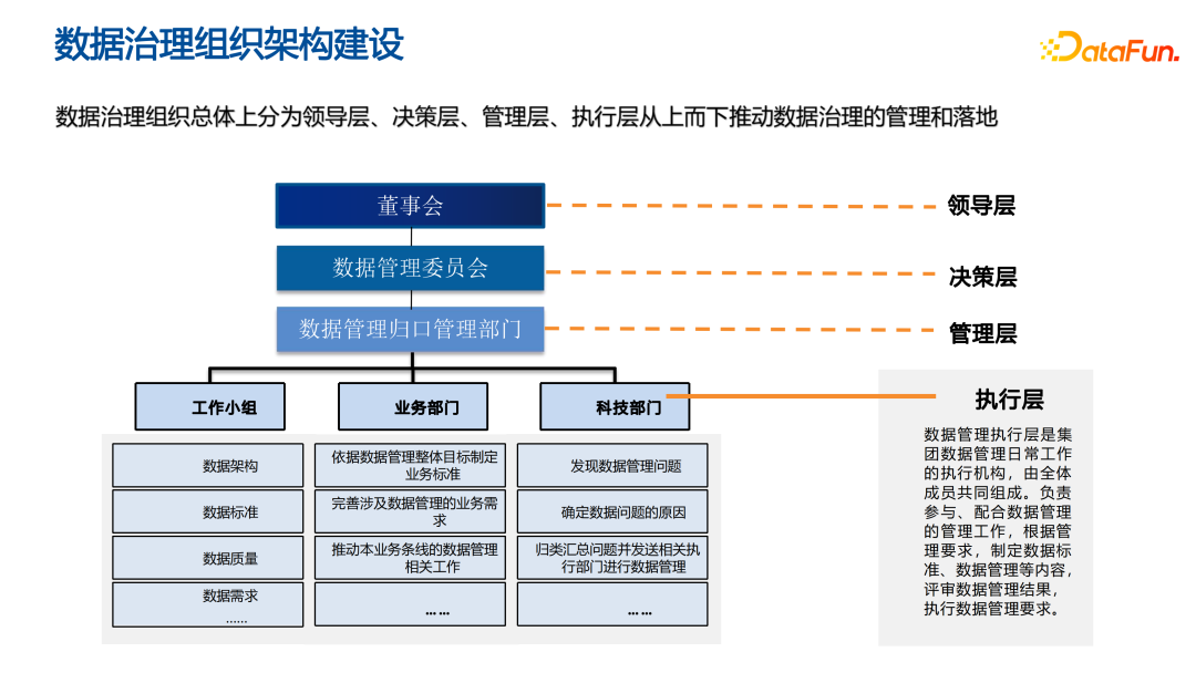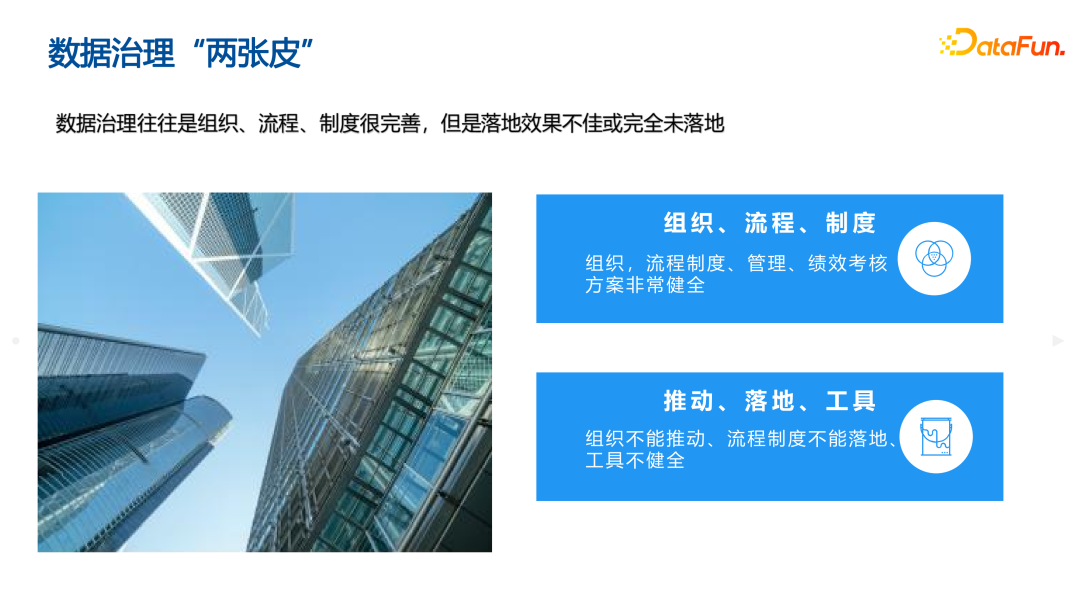 很多公司在数据治理方面经常陷入“两张皮”的情况。其一是“组织、流程、制度”皮,组织的流程制度很多,也非常全面合理,考核体系、评价体系也建立得十分完善。但到了真正落地的时候却推不动;其二是“推动、落地、工具”皮,这些制度可能不具备落地性,甚至会因为资源问题发生工具不健全的情况。这个问题在传统行业和互联网公司会更严重。