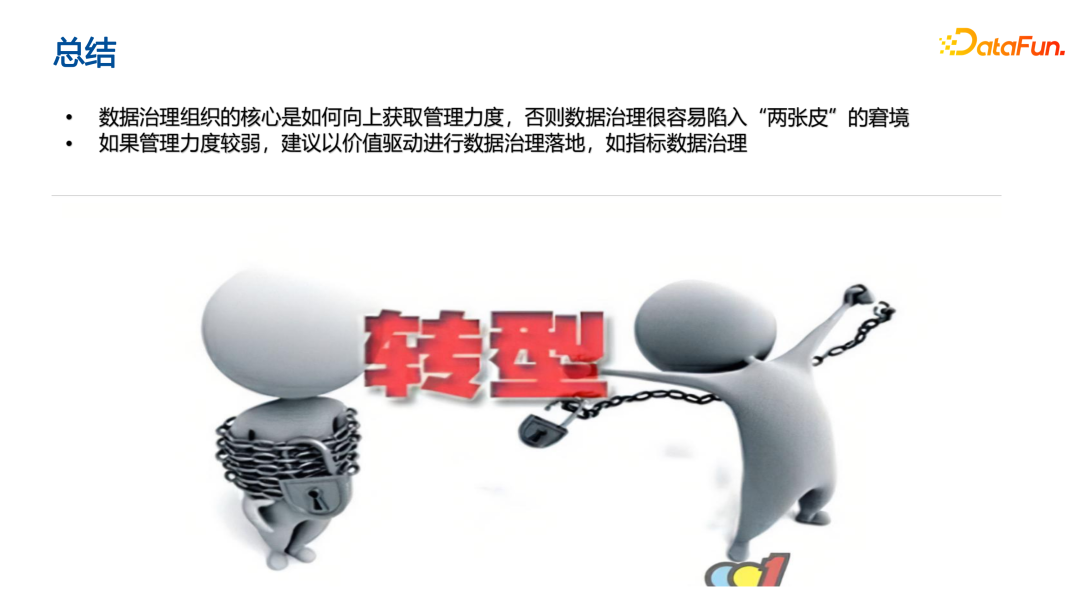在数据治理的过程当中,从上而下推动是十分重要的,数据治理的核心点就在于如何向上获取管理力度。如果一直是从下而上推动的话,数据治理就会被套着一层枷锁,是很难落地的,除了一些管理力度比较弱的情况,例如以价值为驱动的数据治理落地,一般可能会关注指标数据治理。这也是为什么现在的公司做数据治理都是以指标数据治理为出发的。