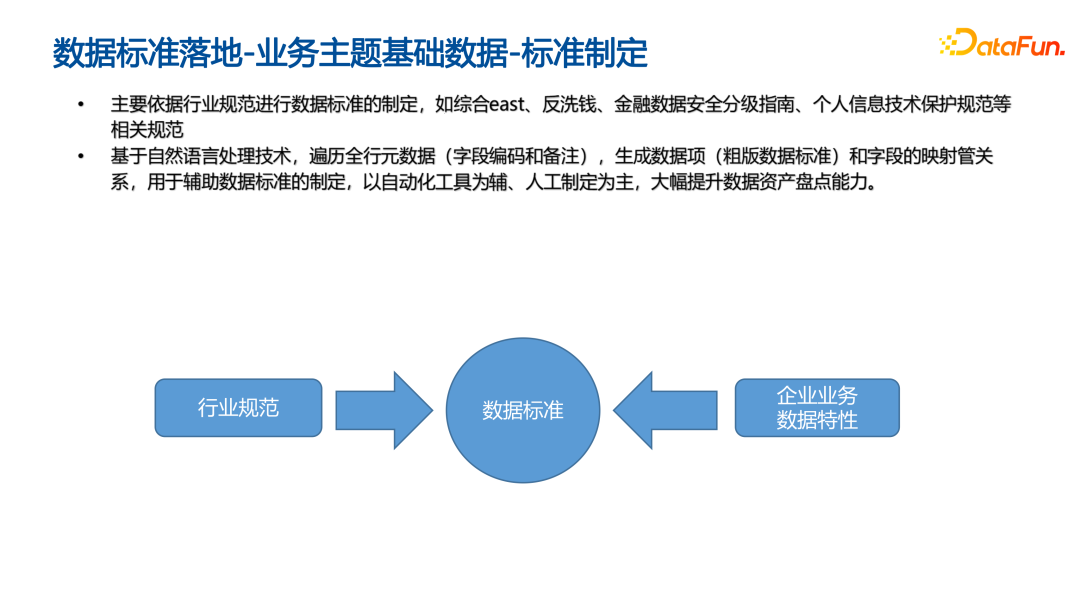 首先,指标数据的落地,百信银行制定了一套业务主题基础数据标准,核心思路是通过制定和达成这些标准,打通整个的关联关系。如何制定这个标准?主要依据的是国家规范以及行业的规范,例如综合EAST、反洗钱、金融数据安全分级、个人信息技术保护的相关规范去制定这个标准。
