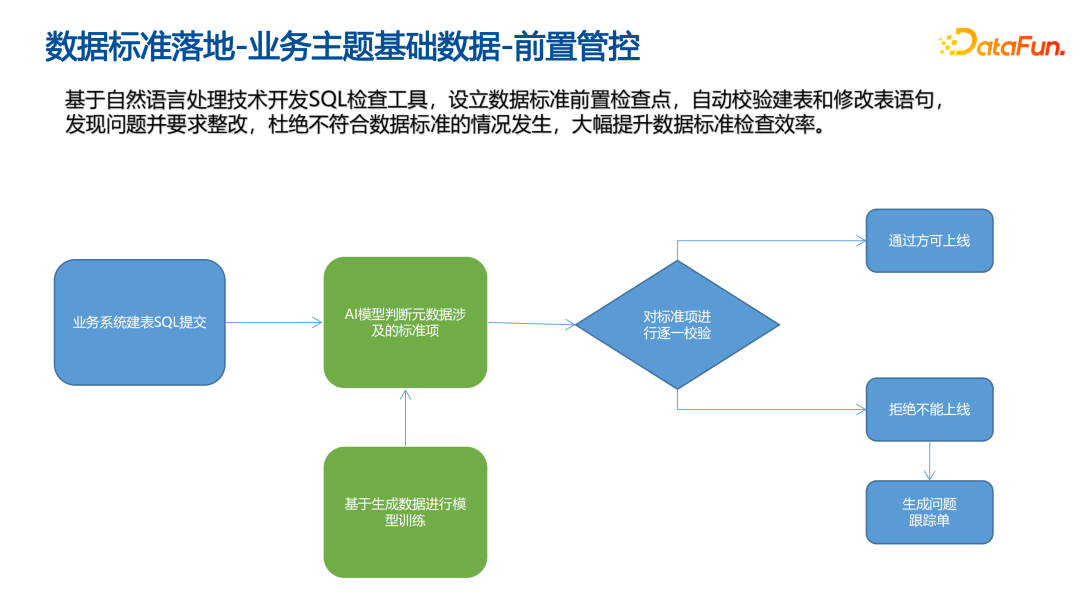 在制定了数据标准后,接下来是对于业务系统的数据标准落地的工作,就要在前置的管控环节对数据标准进行检查。我们嵌入到了整个 DateBox 体系中,在上线的时候会使用一些工具进行检查。核心的逻辑是通过 AI 相关技术,包括自然语言处理技术,发现哪些字段涉及到了数据标准,例如一个 Cust ID,我们也能识别出它是 Consumer ID,即客户号,这时我们会对这个字段的编码和类型进行校验,如果发现不符,我们会进行强制管理,要求必须按统一的标准进行更改。当然这个管理手段是向上汇报得来的,依赖于整个组织的架构去完成的。当不符合标准的时候,我们会拒绝上线,符合标准的时候才会通过元数据把相关信息记录下来,再根据元数据去校验其数据质量,是以数据标准为核心,对整个业务系统的数据进行管控。