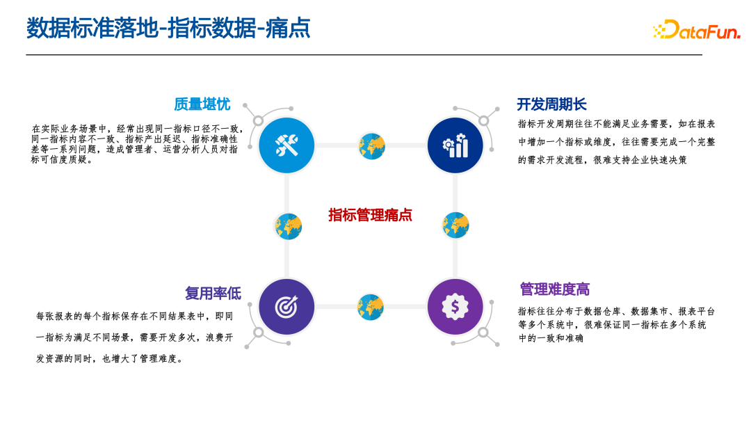 目前,指标数据的管理面临几个痛点,第一是质量堪忧,包括在重要场合口径不一致、同一个指标内容不一致、产出的延迟和数据准确性等一系列问题,造成管理者和分析人员对其可信度产生较大质疑;第二是开发周期比较长,不能满足业务的需求;第三是复用率低,例如在报表中,同样指标在多张报表中重复出现,造成大量重复开发的工作;第四个是管理难度较高,指标是分布于数据仓库、数据集市、报表平台等多个系统中的,因为数据架构的层级较多,我们很难做到统一管理,也就是很难做到一个指标在这些平台、数据仓库中是一致的。但传统 BI 无法解决这些问题。传统 BI 的核心理念是,传统 BI 工具只是对数据集市中数据表的引入,而没有对数仓进行管理,只是在报表层进行管理;有一些工具可能是对数仓层进行管理,也就是说数据集市跟数仓是一体的,报表层就不一样,这种管理是比较割裂的;公司可能很难做到数据口径一致性的保证,因为可能一个指标会出现在多个报表或者多张表中;还有一个问题,当数据分布于不同的表中。