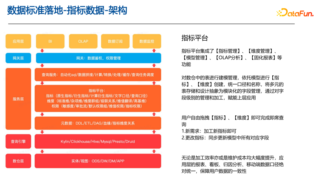 我们怎么来保证数据质量?其实有一个核心理念是“弱集市化”,甚至是没有集市的概念。百信银行的底层是数仓层,查询引擎包括 Kylin、Clickhouse、Hive、MySQL、Presto、Druid 等一系列的查询引擎,我们希望做到分析平台是直接面向数仓的,具体做法是数仓会导入 Clickhouse 中,也就是按照维度建模来进行:实时表、维度表和指标维度会导入到整个平台中,即导入 Clickhouse 这个引擎中;上层是完全没有数据集市的,是通过选取指标维度自动拼装 SQL,再对数仓进行查询操作,完成从集市或从报表到集市到数仓的统计管理,也就是说指标口径是在报表层和数仓层统一发挥作用,而不是割裂的,最后达成效果是完全去集市化的状态。指标管理,核心是把指标化成了原生指标、衍生指标和计算指标。例如,原生指标是授信用户数,而衍生指标可能是某个产品的授信用户数,计算指标可能是一个或多个指标儿通过某种计算后得来的一个指标。所有指标的定义都是在这套平台中完成的,底层的数仓其实只存原生指标;所有衍生指标、计算指标都是自动生成的。然后就是维度的管理,我们会分成标准维跟杂项维来确定管理;接下来是对于模型的管理,就是在建模型的时候根据指标维度去建立整个模型,这是业内很标准的做法,也是整个数据标准的管理。最后达到的效果是在整个分析的过程中,业务只需要关心维度和指标,完全不会有报表的概念,即业务在分析的时候,只要选出授信户数,我们会告诉业务,授信用户是可以从哪些维度去看;在他选取某一个维度后,我们可以会告诉他,这些维度可以出哪些指标;最后通过保存模板的方式进行即时查询,包括其他项目和报表的需求,也可以通过保存模板的方式去完成发布,包括在大屏上展示。从管理的角度来说,报表、指标、数仓、集市是一系列完全达成了统一管理的状态;从用户角度来说,用户对于底层的逻辑基本上完全不用关心;从效率角度上来说,基本上不会重复的开发同一个指标,因为指标都是从底层同一个表中取出来的,如果不是从同一个表中取的,我们也会在底层对两个指标进行校验;对衍生指标和计算指标的逻辑来说,当需要衍生指标和计算指标是,直接就在平台上完成配置,大大提升了开发效率。