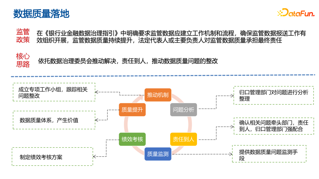 这数据质量的落地,主要的还是推动工作。在 EAST 报送的相关工作中会遇到大量的底层明细数据的质量问题,那这些数据质量问题怎么通过“责任到人”来推动问题的整改呢?首先要建立机制,要让业务部门认识数据质量的问题是业务的问题,而不是科技的问题;然后可以开整改单,划分哪些是业务的问题,哪些是科技的问题,落实责任到人,发挥全行的力量去推动。核心上来说,是借助组织的力量去推动整改的工作。