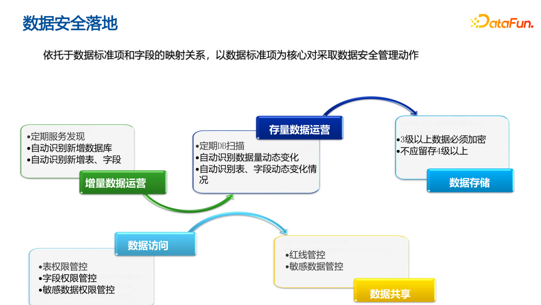 数据安全的落地,就是以数据标准为核心,把数据安全分级、分类,把安全等级打到数据标准上去,最后以数据标准为核心,采取管理动作,例如增量数据的运营,我们会在增量数据产生的过程中,对这个数据中的字段进行打标操作;存量数据的运营,我们会定期扫描,包括对表中字段的变化,自动按标准打标;必须根据标准对三级以上的数据加密,对四级以上的数据不应该留存的。在数据访问过程中,我们也是根据标准来控制表权限、字段权限以及敏感数据权限的;在数据共享的过程中,因为我们已经知道了数据所属的等级,以及对应等级的防空要求和红线的要求,包括对敏感数据的管控,在共享的时候是可以很容易实现的。以上就是今天的所有分享。