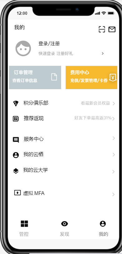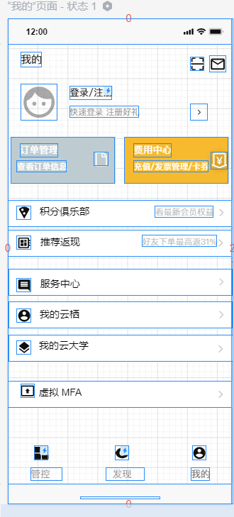 首先第一步制作的是登录页面,相对其他页面也是比较简单的,也添加了交互时间,点击注册按钮跳转至云产品页面(发现页面)。