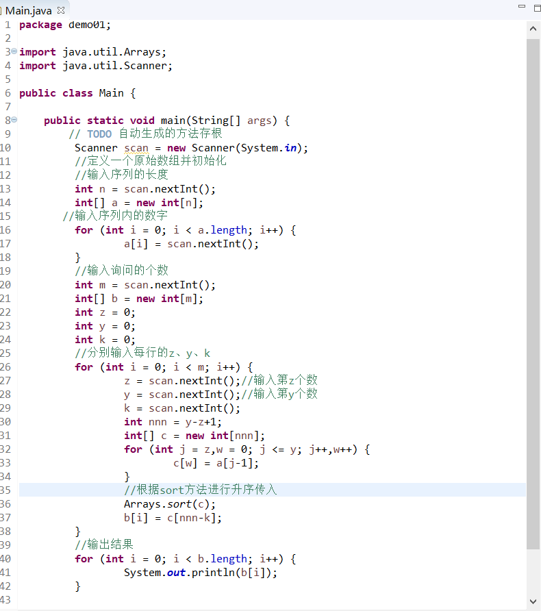2.解题思路:定义一个原始数组并初始化,用循环来处理多组数据,再输入序列的长度,其次输入序列中的数字以及询问的个数,升序传入我们依据的是sort方法,从而计算出结果。