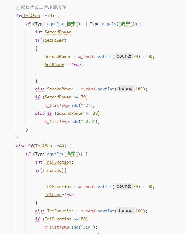 2.代码的注释简洁,这也产生了一定的问题,对于没有注释的代码块并没有文档说明这些代码的含义,可能需要阅读者去理解代码的运行逻辑和实际意义,如果产生误解,就会对整体功能的理解存在一定的偏差(如下图为生成算式的核心函数,注释并不多)。