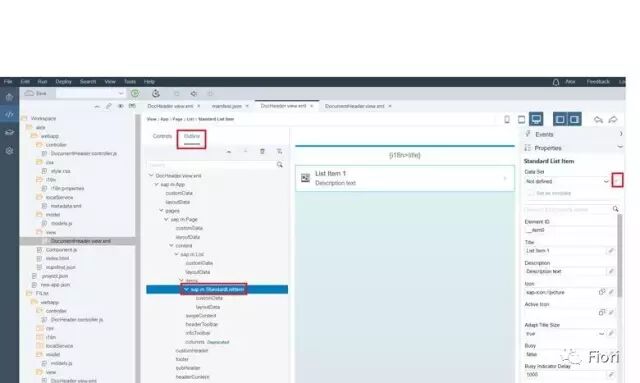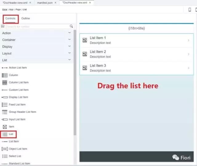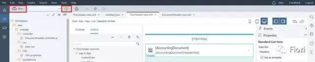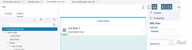 视图文件同样有可视化界面和代码界面,因为我们今天不写代码,所以就用视图界面拖拽了。视图界面主要是HTML5元素组成,如果是HTML5开发者,可以自行选择开发界面。如下图,我拖拽一个List元素到页面中,来显示财务文档的头信息。