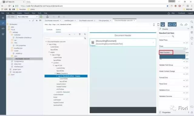 在List item上单击,选择右手边的Events,选择press,创建function,如下图: