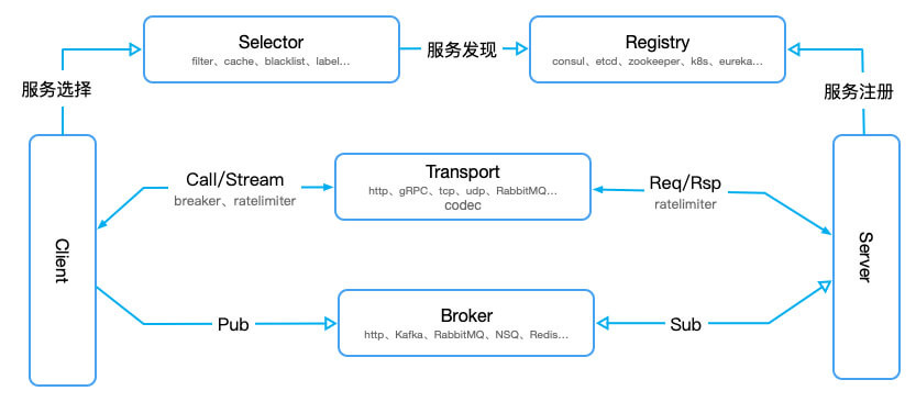 - Client 是请求服务的接口,从 Registry 中获取 Server 信息,然后封装了 Transport 和 Codec 进行 RPC 调用,也封装了 Brocker 进行消息发布,默认通过 RPC 协议进行通信,也可以基于 HTTP 或 gRPC;