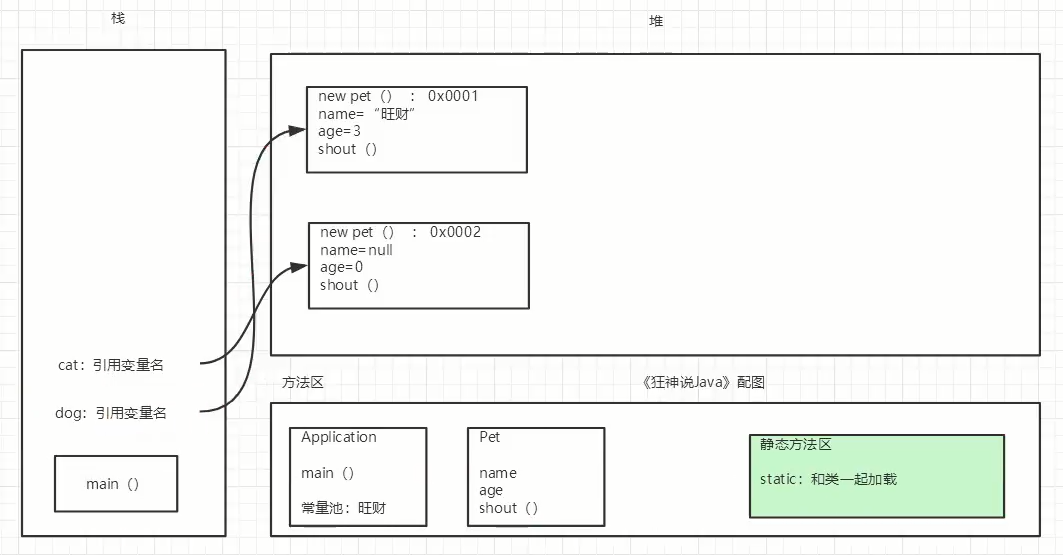 使用new关键字创建的时候,除了分配内存空间之外,还会给创建好的对象进行默认的初始化以及对类中构造器的调用