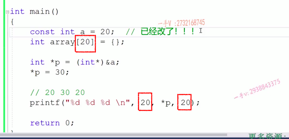 最后输出a,但是却没有输出30,,输出a是20,是因为是输出的20跟a的内存没有关系,编译的时候,a早就被替换掉了(这也是C++里面const的变量要进行初始化的原因,不初始化,拿什么替换?!)。