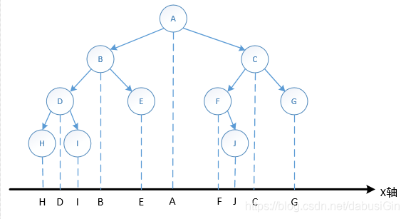 方法:在二叉树下画一条线作为X轴,把所有节点投影到X轴上,从左到右排列好,得到的结果就是中序遍历的结果。
