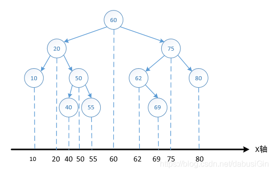 得到“10 20 40 50 55 60 62 69 75 80”是中序遍历的结果。