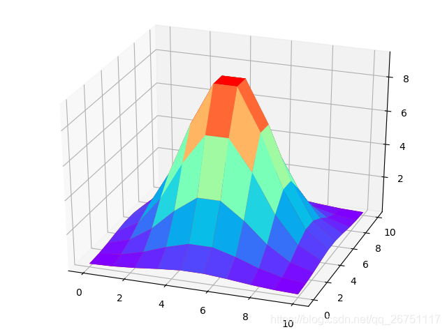 ax.plot_surface(X, Y, R, rstride=1, cstride=1, cmap='rainbow')