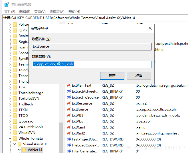 打开注册表,找到如下位置: HKEY_CURRENT_USER\Software\Whole Tomato\Visual Assist X\VANet10。在右边找到 ExtSource 项目,鼠标右键选修改,在原有文字后 添加如下文字:.cu;.cuh; 确定后关闭注册表。
