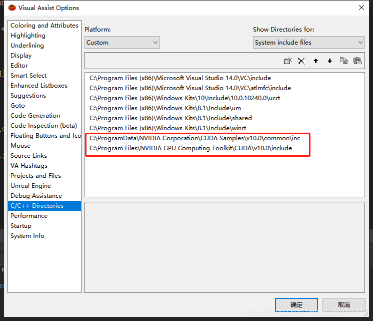 第二步,是设置 visual assist 的目录。在小番茄的 c/c++directory 里面,选择 custom 选项,然后包含你的 cuda 的 sdk 目录,效果如图: