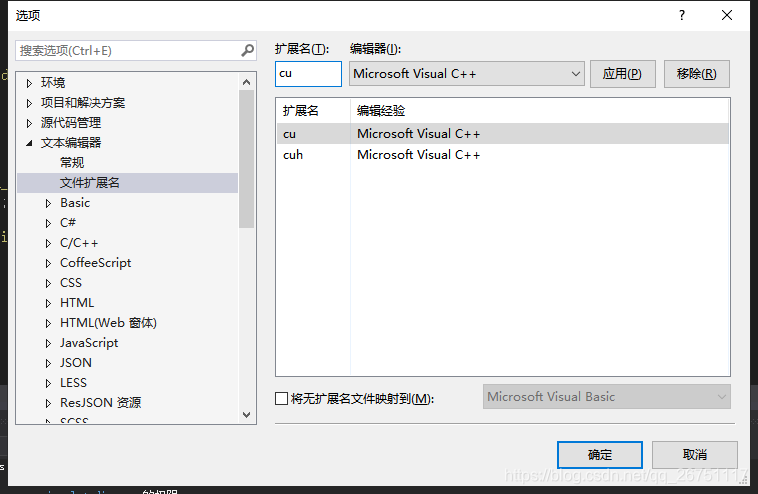第一步,是在 vs2015 里面设置 vc++ 文件支持. cu;cuh; 文件。方法:工具 -> 选项 -> 文本编辑器 -> 文件扩展名。
