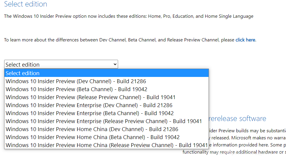 按理说在设置 - 更新和安全 - Windows 预览体验计划里面注册后,就能直接更新 insider preview 版本的操作系统,但是我试了几次都没用,所以直接去微软官网下载 iso 镜像 https://www.microsoft.com/en-us/software-download/windowsinsiderpreviewiso,在下拉框选择版本,注意要安装 cuda 的话英伟达要求 windows 版本为 Build 20145 或更高,所以选择 dev channel。