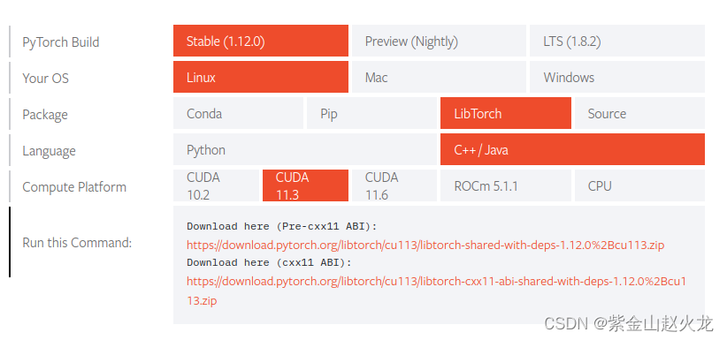 https://download.pytorch.org/libtorch/cu111/libtorch-cxx11-abi-shared-with-deps-1.10.2+cu111.zip gpu 版本要先看自己的 cuda 版本,我的是 11.1,所以上面两处都是 cu111,然后在改 pytorch 版本号 1.10.2。这么操作就可以下载自己需要的 libtorch 版本了。