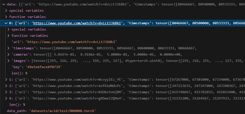 数据构造:包含url、时间戳、相机参数(没看懂)、连续帧图像、key