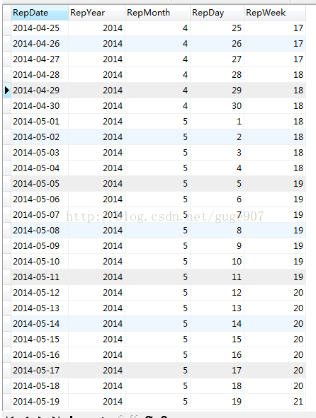 1 CREATE TABLE obj_date ( 2 RepDate date NOT NULL, //日期,如‘2014-05-07’ 3 RepYear int(8) DEFAULT NULL, //年,如2014 4 RepMonth int(8) DEFAULT NULL, //月,如5 5 RepDay int(8) DEFAULT NULL, //日,如7 6 RepWeek int(8) DEFAULT NULL, //周,一年约52周,‘2014-05-07’是第19周 7 PRIMARY KEY (RepDate) 8 )