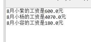 package 第十五次作业; public class TestCompany { /** * @param args */ public static void main(String[] args) { // TODO Auto-generated method stub ColaEmployee[] c={ new SalariedEmployee("小紫", 4, 500), new HourlyEmployee("小杨", 5, 20, 189), new SalesEmployee("小容", 9, 900, 0.2) }; for (int i = 0; i < c.length; i++) { new Company().getSalary(c[i], 8); } } }