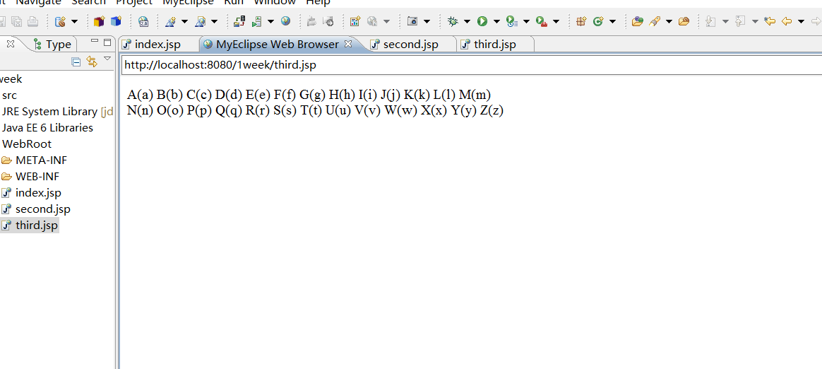 <%@ page language="java" import="java.util.*" pageEncoding="UTF-8"%> <!DOCTYPE HTML PUBLIC "-//W3C//DTD HTML 4.01 Transitional//EN"> <html> <head> <title>My JSP 'index.jsp' starting page</title> </head> <body> <% char c; for(c='A';c<='Z';c++) { out.print(c+"("+(char)(c+32)+")"+" "); if(c=='M') out.print("<br>"); } %> </body> </html>