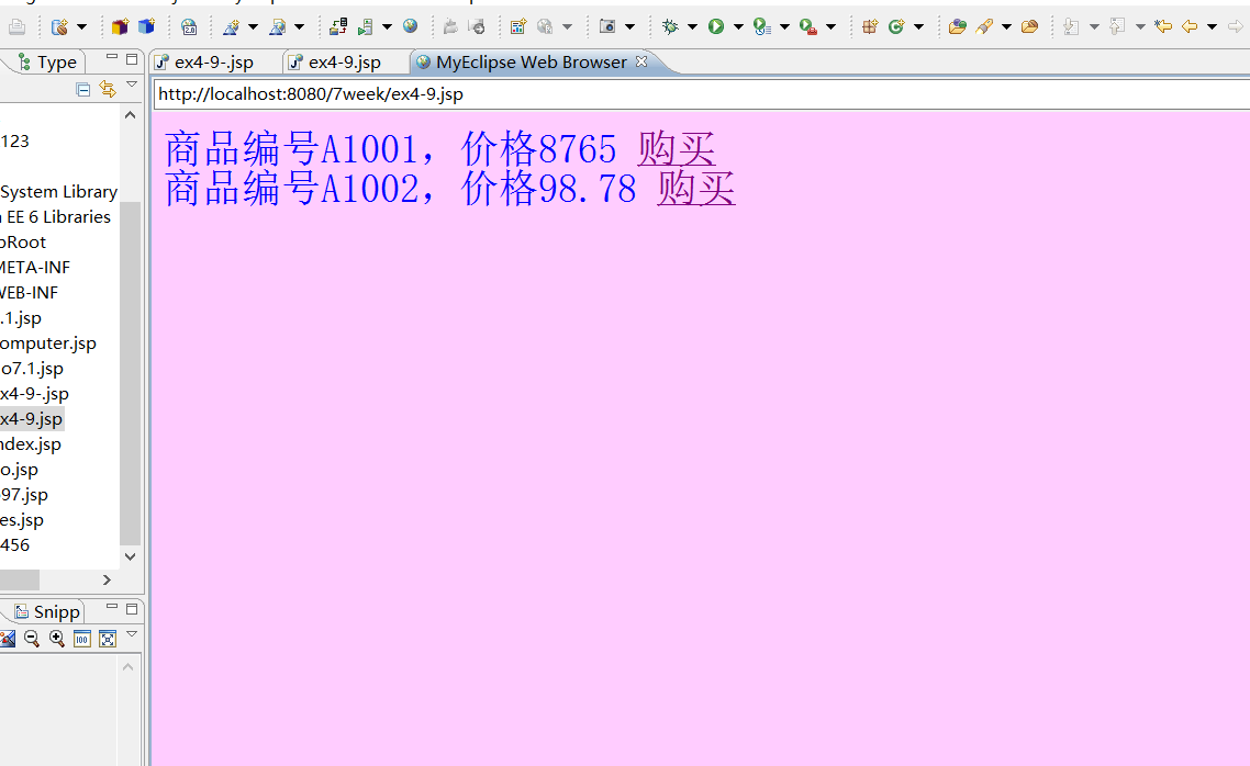 <%@ page language="java" import="java.util.*" pageEncoding="utf-8"%> <html> <head> <title>p78 4-9</title> </head> <body bgcolor=#ffccff> <% double price=98.78; %> <p style="font-family:宋体;font-size:36;color:blue"> 商品编号A1001,价格8765 <a href="ex4-9-.jsp?id=A1001&price=8765">购买</a><br> 商品编号A1002,价格<%=price %> <a href="ex4-9-.jsp?id=A1002&price=<%=price %>">购买</a><br> </p> </body> </html>