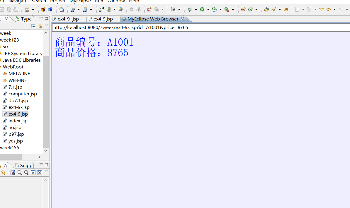<%@ page language="java" import="java.util.*" pageEncoding="utf-8"%> <html> <head> <title></title> </head> <body bgcolor=#EEEEFF> <p style="font-family:宋体;font-size:36;color:blue"> <% String id=request.getParameter("id"); String price=request.getParameter("price"); %> 商品编号:<%=id %><br> 商品价格:<%=price %> </p> </body> </html>