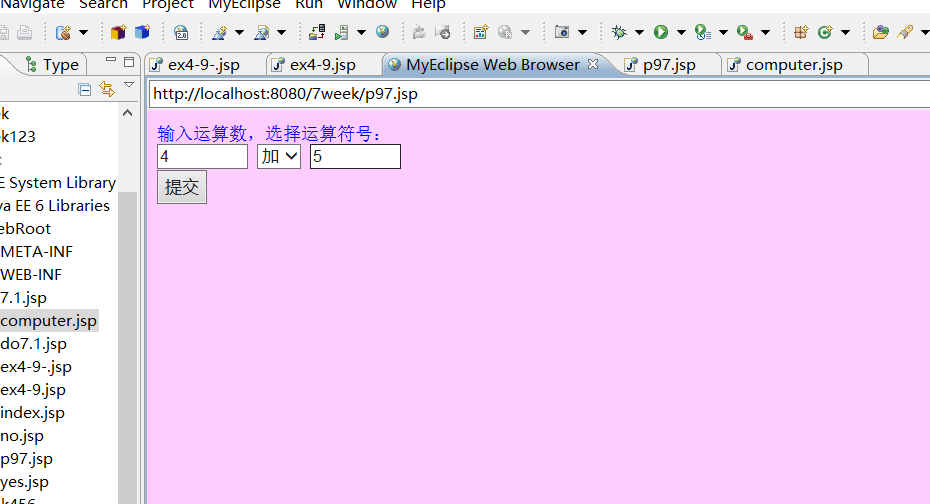 <%@ page language="java" import="java.util.*" pageEncoding="utf-8"%> <html> <head> <title>p97-2</title> </head> <body bgcolor=#ffccff> <form action="computer.jsp" method=post name=form> <p style="font-family:宋体;font-size:18;color:blue"> 输入运算数,选择运算符号:<br> <input type=text name="numberOne" size=6 /> <select name="operator"> <option selected="selected" value="+">加 <option value="-">减 <option value="*">乘 <option value="/">除 </select> <input type=text name="numberTwo" size=6 /> <br> <input type="submit" name="submit" value="提交" /> </form> </body> </html>