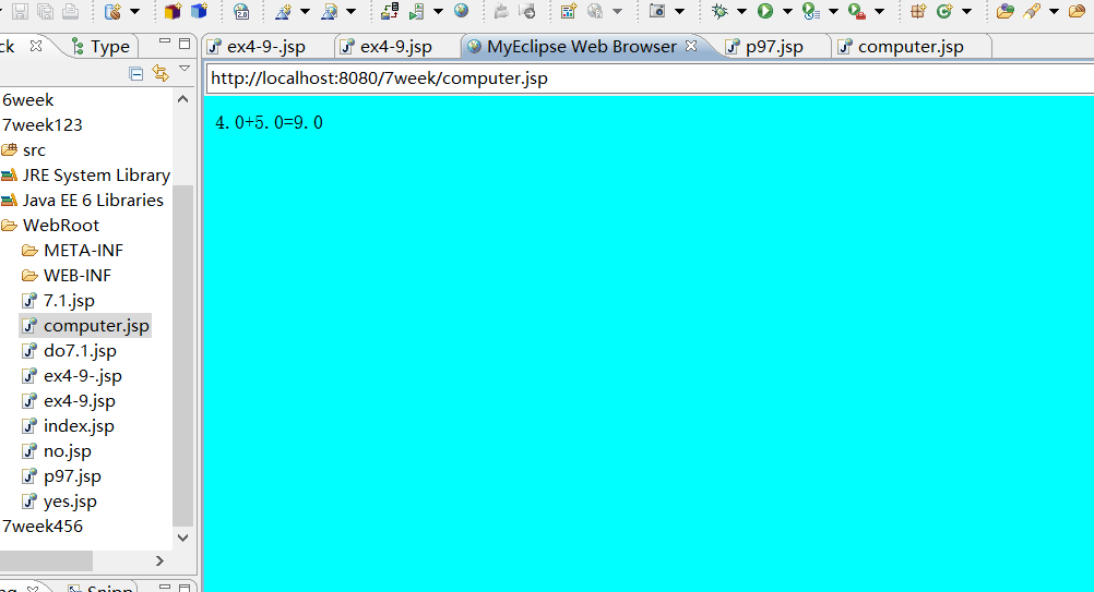 <%@ page language="java" import="java.util.*" pageEncoding="utf-8"%> <html> <head> <title>p97-2</title> </head> <body bgcolor=cyan> <p style="font-family:宋体;font-size:18;color:black"> <% String numberOne=request.getParameter("numberOne"); String numberTwo=request.getParameter("numberTwo"); String operator=request.getParameter("operator"); if(numberOne==null||numberOne.length()==0){ response.sendRedirect("p97.jsp"); return; } else if(numberTwo==null||numberTwo.length()==0){ response.sendRedirect("p97.jsp"); return; } try{ double a=Double.parseDouble(numberOne); double b=Double.parseDouble(numberTwo); double r=0; if(operator.equals("+")) r=a+b; else if(operator.equals("-")) r=a-b; else if(operator.equals("*")) r=a*b; else if(operator.equals("/")) r=a/b; out.println(a+""+operator+""+b+"="+r); }catch(Exception e){ out.println("请输入数字字符"); } %> </body> </html>