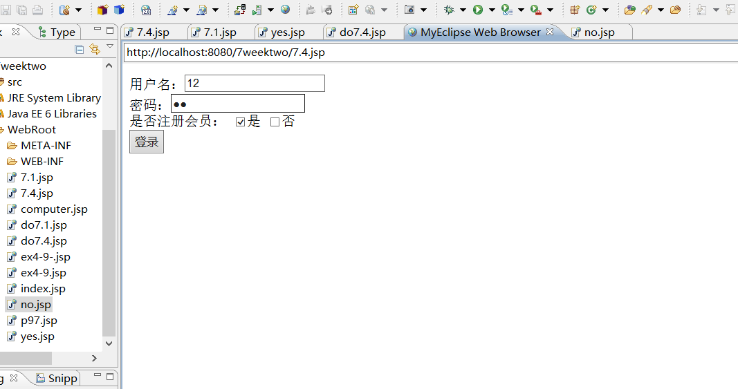 <%@ page language="java" import="java.util.*" pageEncoding="utf-8"%> <html> <head> <title>My JSP 'index.jsp' starting page</title> </head> <body> <% request.setCharacterEncoding("utf-8"); String uname=request.getParameter("uname"); String upwd=request.getParameter("upwd"); if(uname.equals(upwd)) request.getRequestDispatcher("y2.jsp").forward(request,response); else request.getRequestDispatcher("no.jsp").forward(request,response); %> </body> </html>