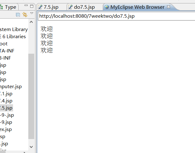 <%@ page language="java" import="java.util.*" pageEncoding="utf-8"%> <html> <head> <title>在页面1的表单内输人一个数字N,提交,能够在另一个页面打印N个“欢迎”字符串</title> </head> <body> <% String number=request.getParameter("number"); double n=Double.parseDouble(number); for(int i=0;i<n;i++){ out.println("欢迎"+"<br>"); } %> </body> </html>