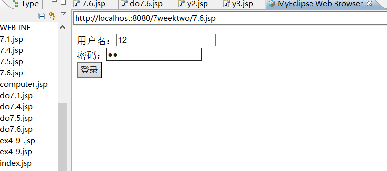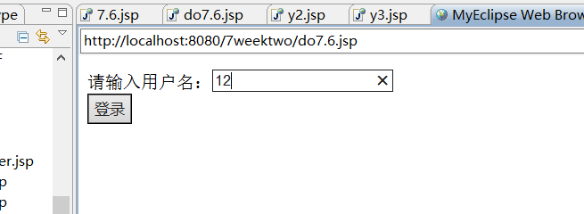<%@ page language="java" import="java.util.*" pageEncoding="utf-8"%> <html> <head> <title>My JSP 'index.jsp' starting page</title> </head> <body> <% request.setCharacterEncoding("utf-8"); String uname=request.getParameter("uname"); String upwd=request.getParameter("upwd"); %> <form name="form" action="y3.jsp" method="post"> 请输入用户名:<input type="text" name="unameTwo"><br> <input type="hidden" name="upwdTwo" value="<%=upwd%>" /> <input type="submit" value="登录" > </form> </body> </html>