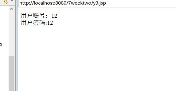 <%@ page language="java" import="java.util.*" pageEncoding="utf-8"%> <html> <head> <title>My JSP 'index.jsp' starting page</title> </head> <body> <% request.setCharacterEncoding("utf-8"); String unameTwo=request.getParameter("unameTwo"); String upwdTwo=request.getParameter("upwdTwo"); %> 用户账号:<%=unameTwo %><br> 用户密码:<%=upwdTwo %> </body> </html>