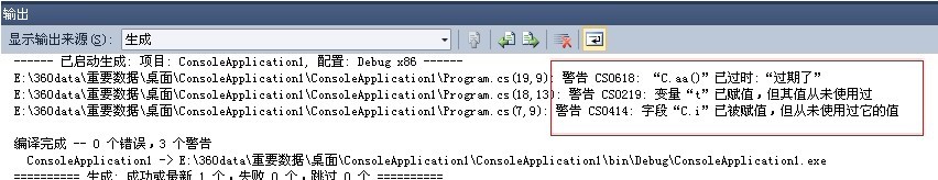 1 public class C 2 { 3 int i = 10;//警告:C.i已赋值,但从未使用过它的值 4 [Obsolete("过期了",false)] 5 public static void aa() 6 { 7 8 } 9 10 static void Main() 11 { 12 int t=5; //警告:t已赋值,但其值从未使用 13 aa(); //警告:过期了 14 } 15 }