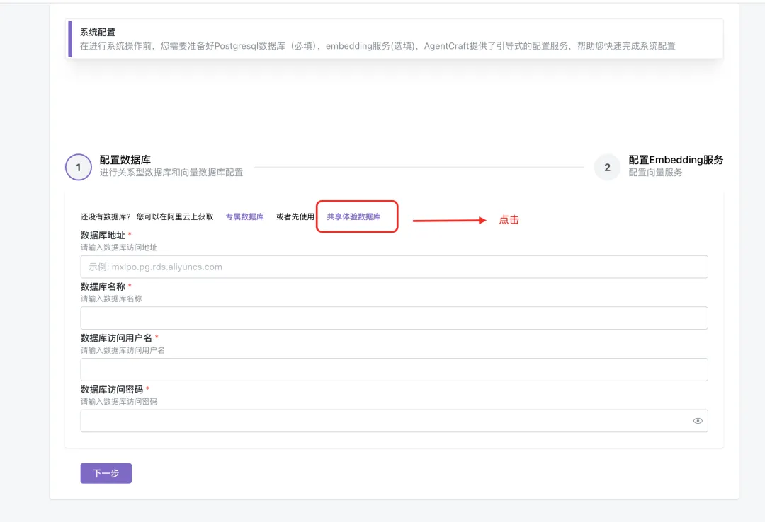 - 数据库配置,这里快速体验可以选择共享数据库,社区提供了一个独立数据库用于简单测试(测试完可以随时删除个人数据),强烈建议您使用自己的专属数据库, 这样所有的数据都会由您专属管理,点击“专属数据库”可以查看指引。