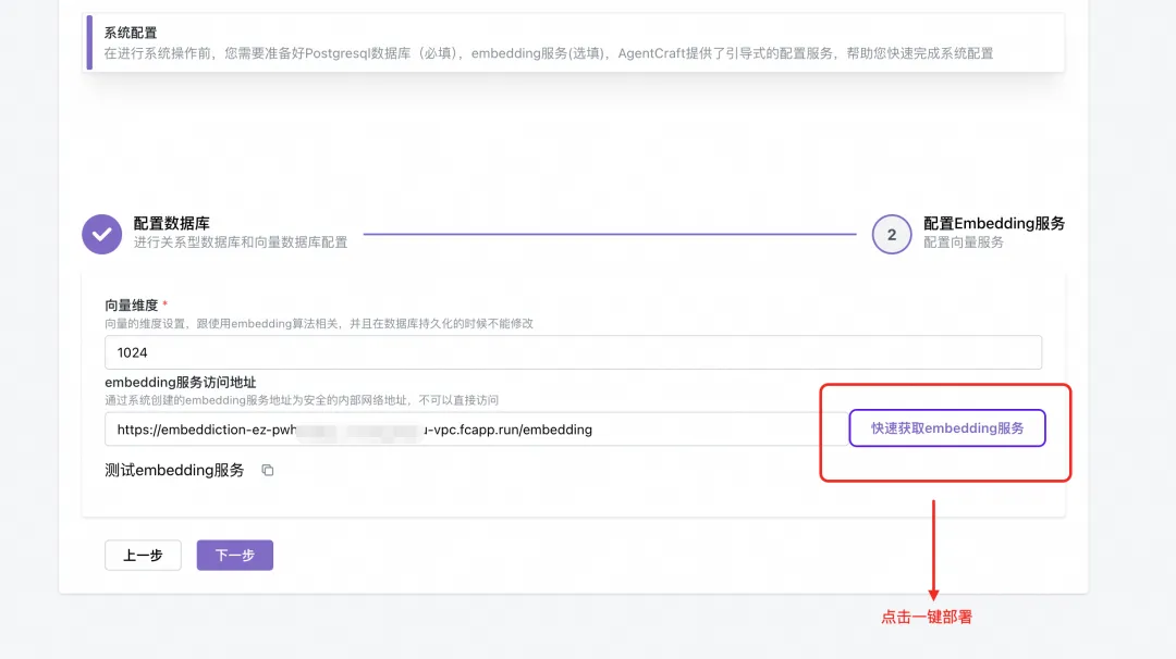 - 部署向量模型,AgentCraft 采用的是 large-bge 向量模型,您可以在这里一键部署,如果不需要使用知识库检索能力,可以直接跳过。