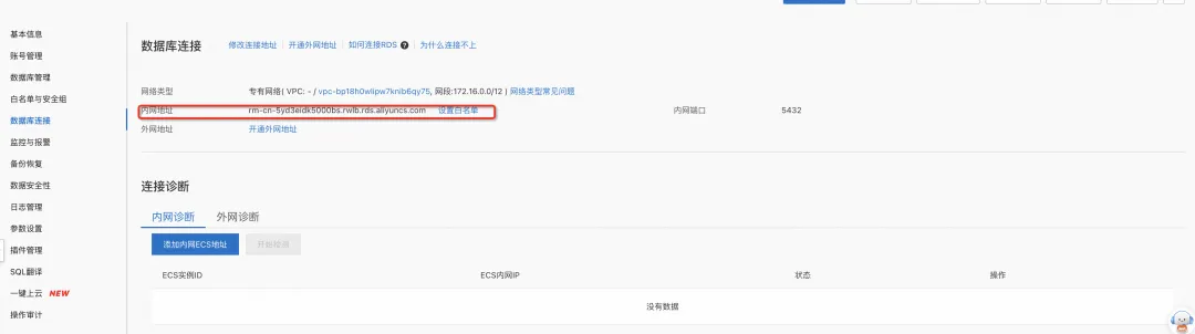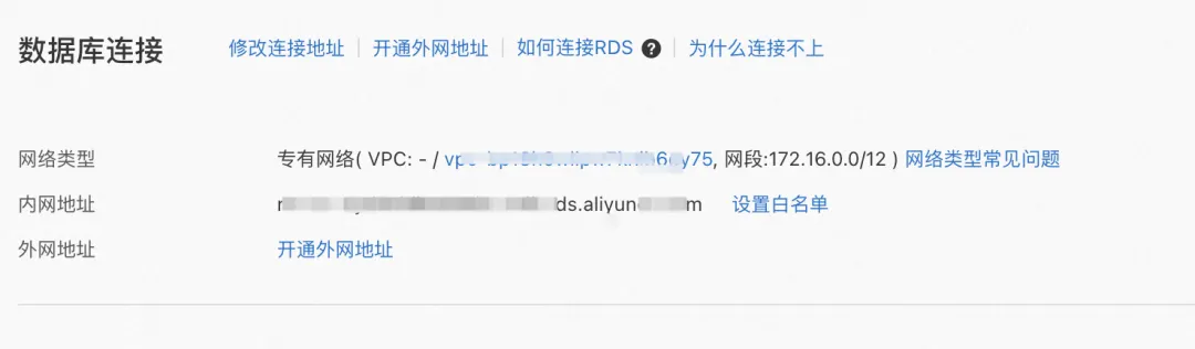 如果已配置 VPC 数据库还是连接不上,建议可以先开放数据库公网连接进行测试。等调通后再去解决网络连接问题。